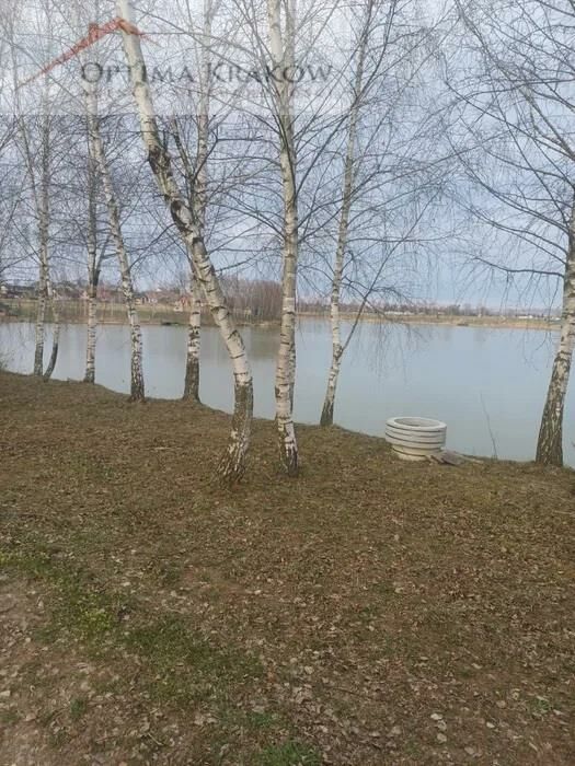 Z działek widok na zbiornik wodny, obok zabudowa jednorodzinna.